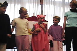 Japanischlernende Kinder, Franziska(20), Linus(10), Severin(9), Frederique(9), Friedlich(9) spielten den kleinen Sketch „Sambiki no Kobuta – Drei Ferkelchen“